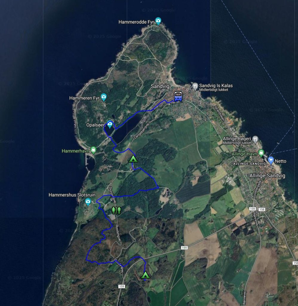 Vi tager bilen til Ystad og færgen videre til Rønne. Herfra Bus 7 fra Rønne til Sandvig. Forventet ankomst kl. 15:20 til Sandvig Gl. Station.
