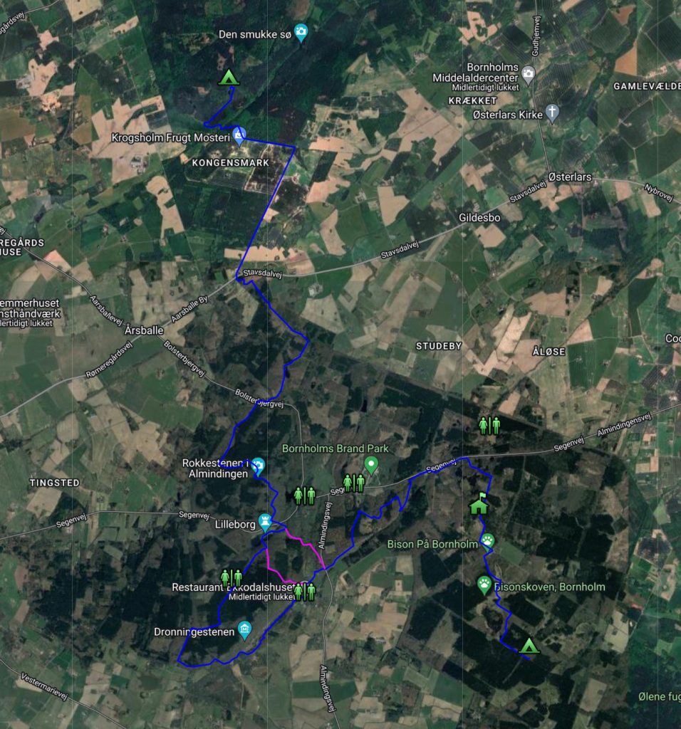 Vandreturen går videre tværs over Bornholm til endnu en helt primitiv teltplads ved Svinemosevej.